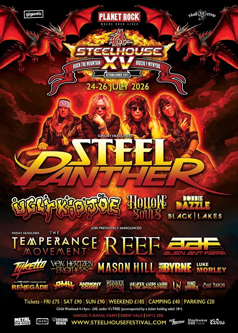 Steelhouse - the festival on the top of a Welsh mountain – have confirmed who now will headline and close out the festival’s 15th year celebrations on Sunday the 26th July 2026. None other than the mighty Steel Panther. And just to make sure Steelhouse Sunday is the most party hard day we've ever had on The Mountain, we're also adding another bunch of Californian rascals to the bill, none other than Ugly Kid Joe! When it comes to a live show they know what's required...Anyone who has seen them lately will attest to that. Let the good times roll!' With Bobbie Dazzle, Hollow Souls and Black Lakes also announced, this is going to be another amazing year. What’s more is that there is good news in that there are still more bill announcements to come, but bad news as very limited glamping options remain, so don’t delay if you want to join the fun.